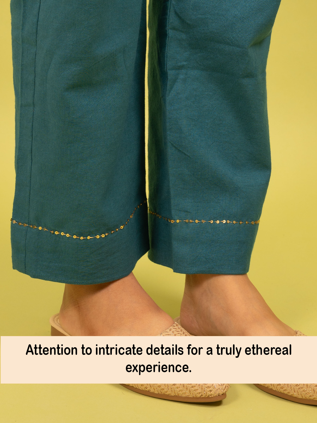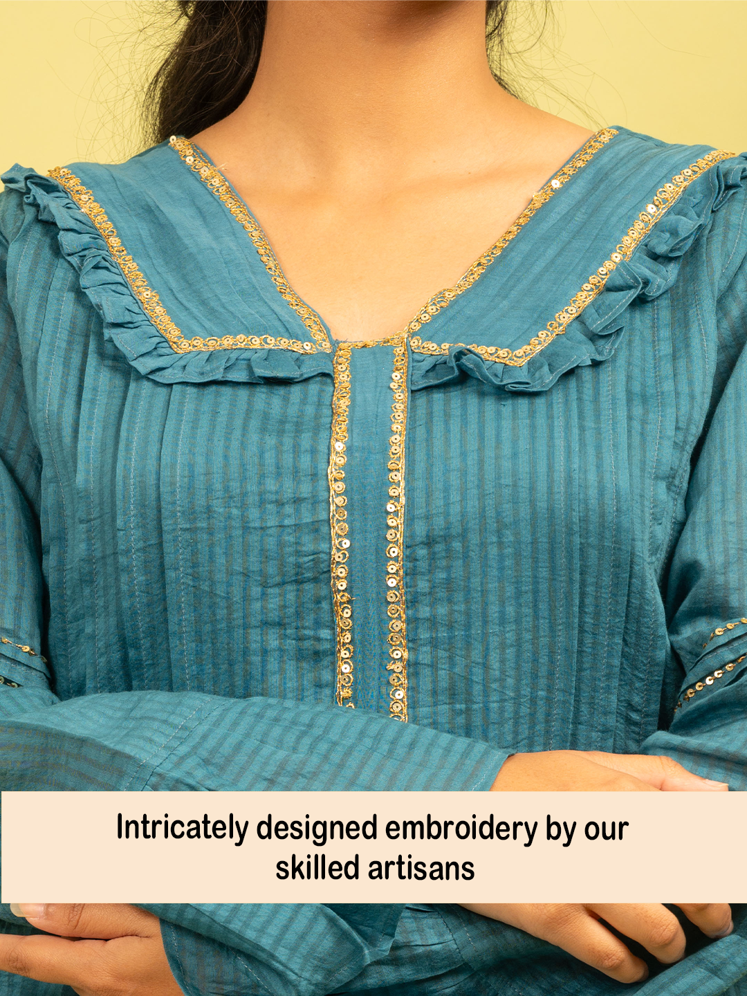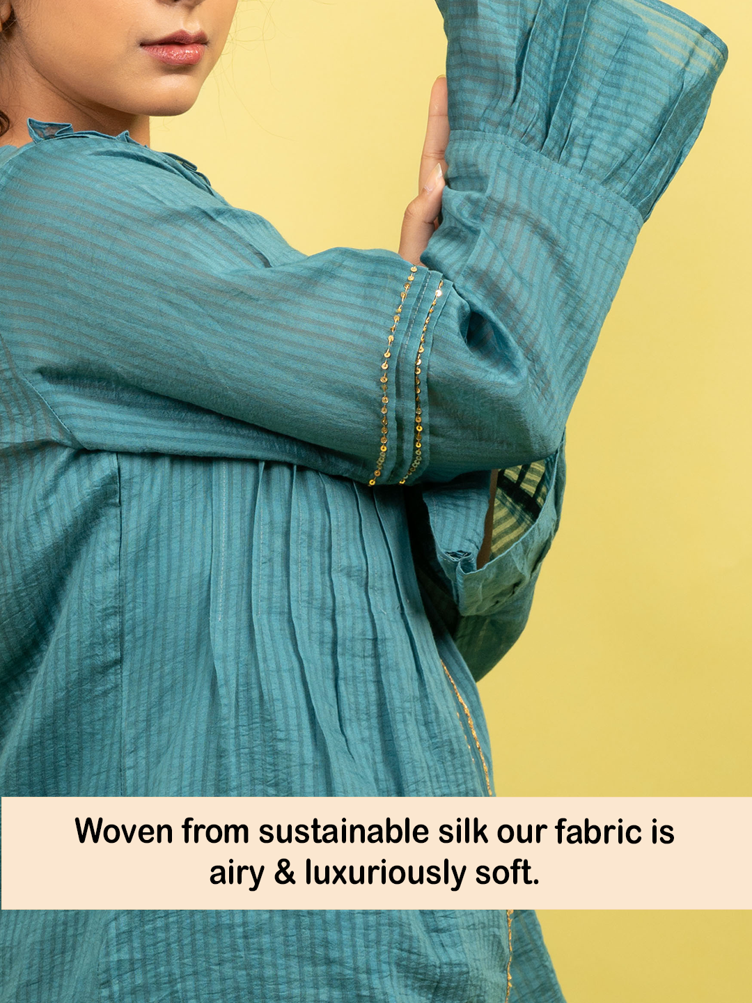 Our Baali Co-ord set is a versatile piece in handwoven striped silk fabric and is paired with our organic Pants. It comes with delicate embroidery on the top.