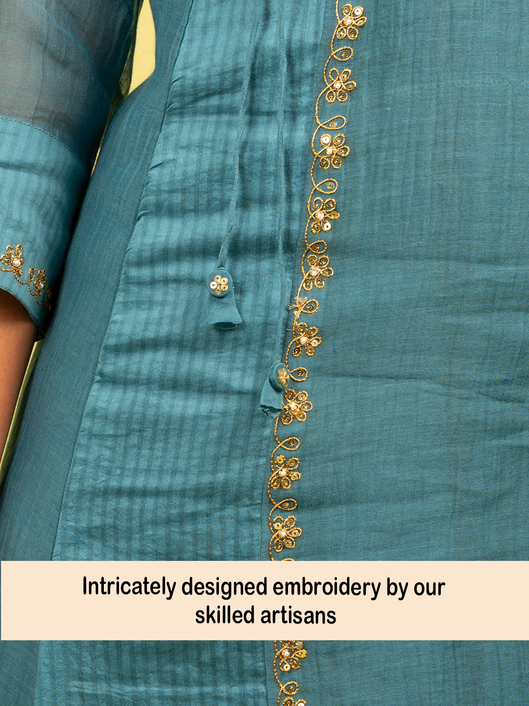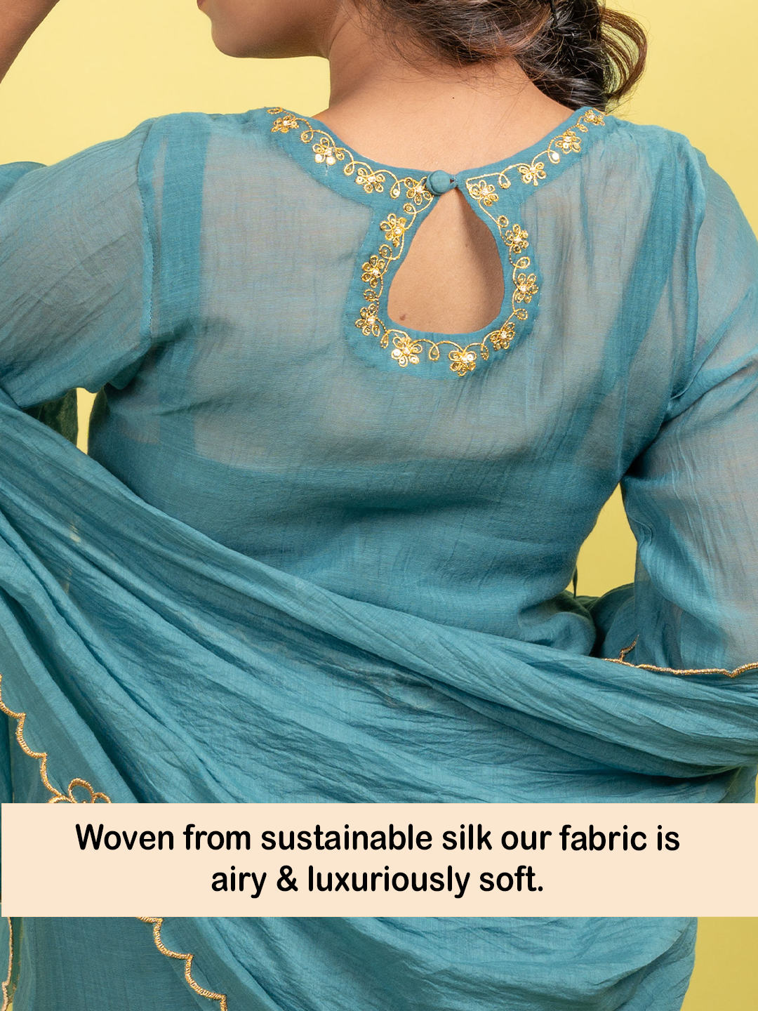 Indulge in the elegance of handwoven silk, adorned with exquisite embroidery on the kurta. This silk ensemble includes a matching dupatta and a timeless lower, making it a lightweight, festive addition to your celebratory wardrobe."