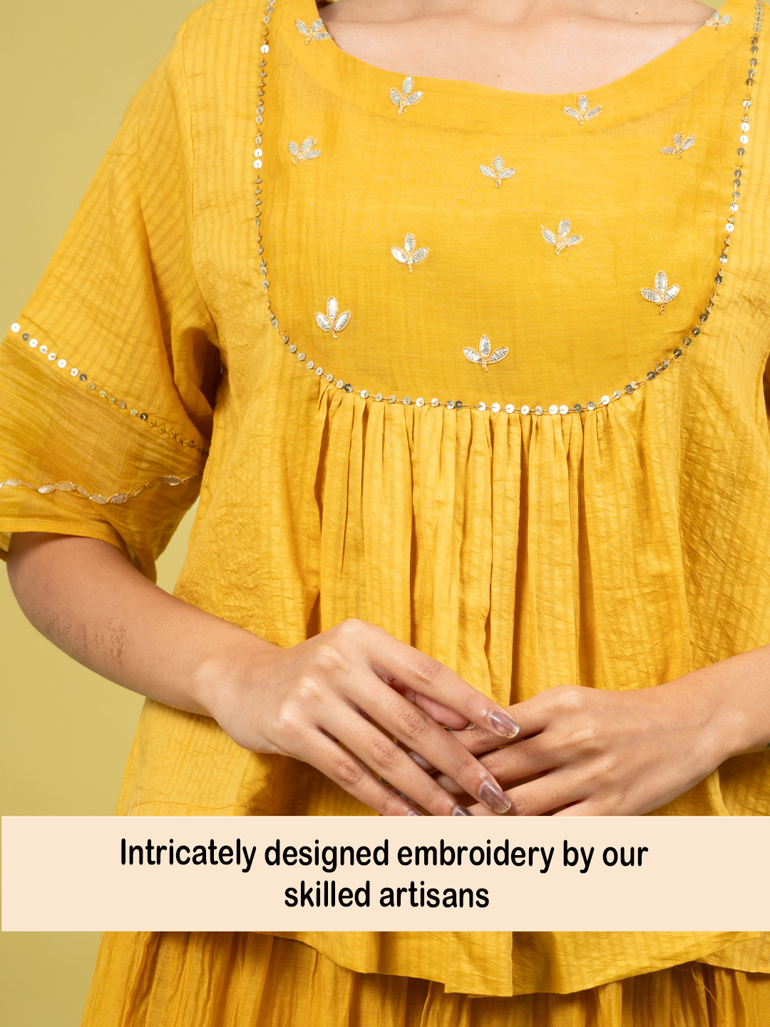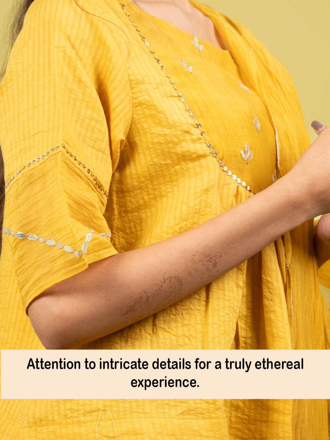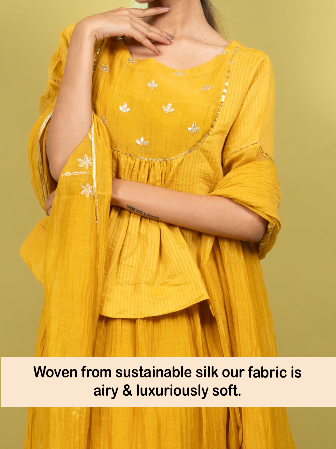 Indulge in the elegance of handwoven silk, adorned with exquisite gota embroidery on the blouse. This silk ensemble includes a matching dupatta and a gathered skirt, making it a lightweight, festive addition to your celebratory wardrobe."