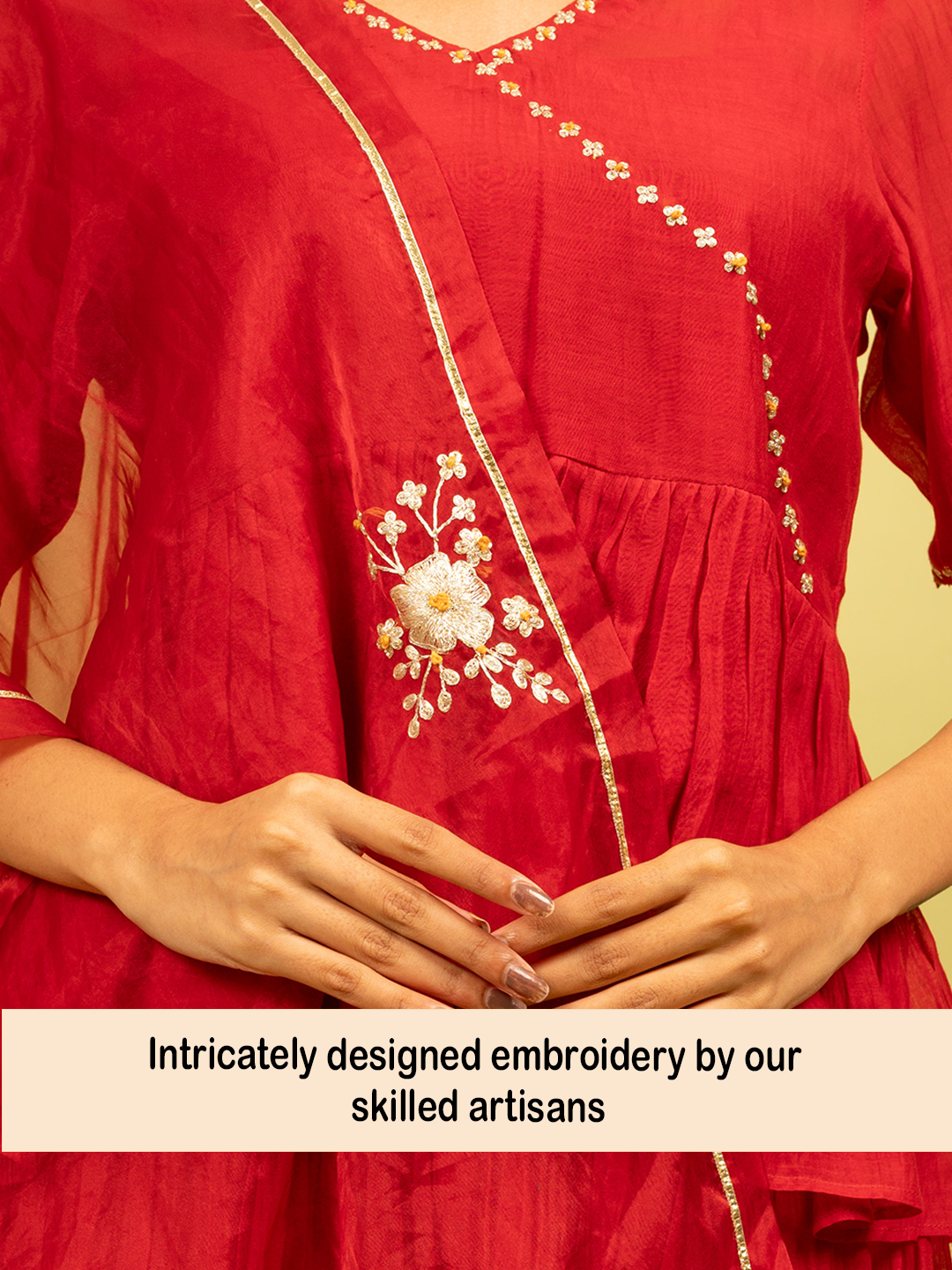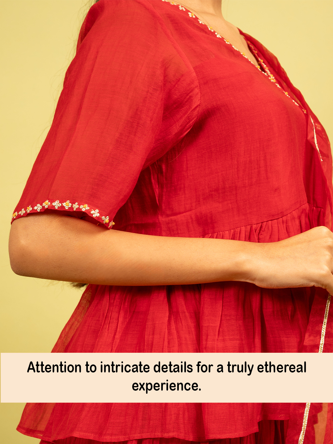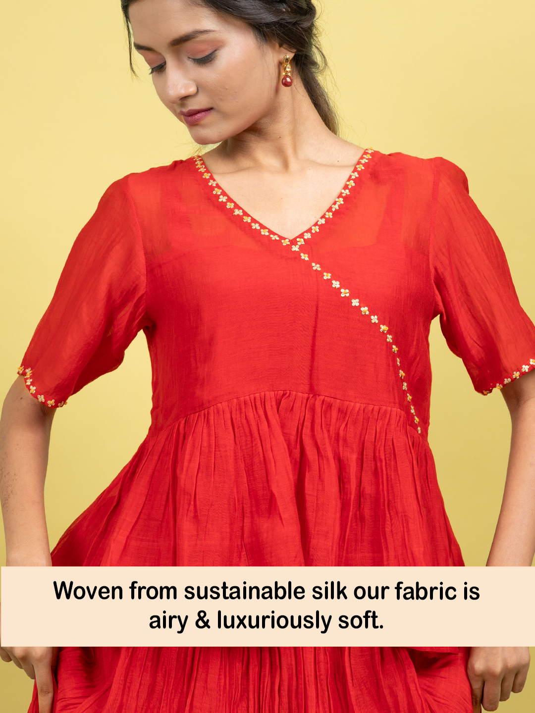 Indulge in the elegance of handwoven silk, adorned with exquisite embroidery on the blouse. This silk ensemble includes a matching dupatta and a gathered skirt, making it a lightweight, festive addition to your celebratory wardrobe."